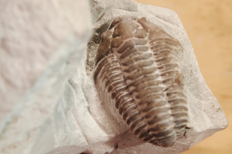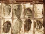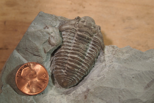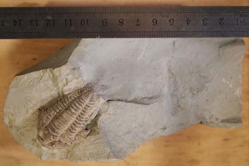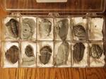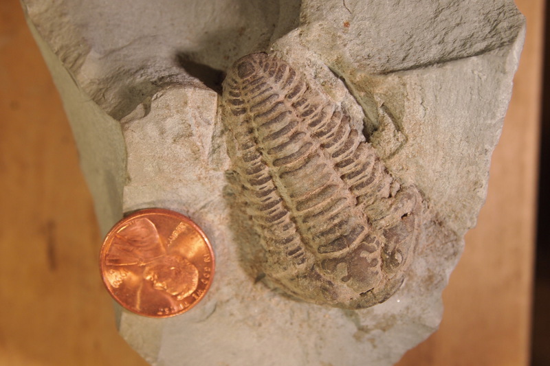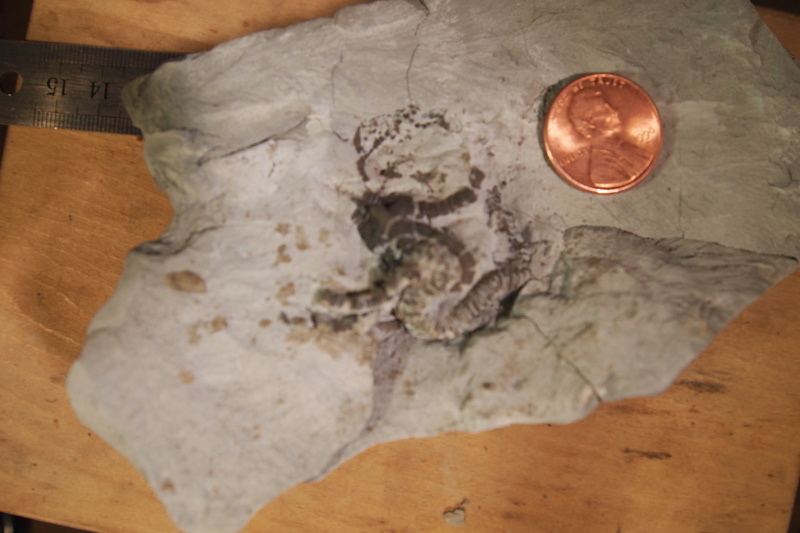 Perhaps 6 to 10 feet above the base was an unusual bryozoa layer containing Heterotrypa and Monticulopora colonies within a distinct horizon. Above this layer began the brown shales which contained the two foot thick blue gray shale unit from which the Flexicalymene meeki trilobites shown here were mined. The base of the shale was about five feet above the bryozoa horizon and it had an expanse of about 80 feet across the outcrop, lensing abruptly on each side into the brown shales over a distance of just a few feet. I interpreted the blue gray shale to be a channel consisting of an upper and lower horizon separated by a thin micritic layer of less than an inch in thickness which also occasionally contained trilobites. In one instance there was a cluster of seven individuals, one a bit larger than the others, the only cluster ever observed and they were all prone and right side up. The two thick blue gray shale units were fairly homogenous with regard to bedding and the trilobites were found somewhat randomly within it. Prone trilobites were more often found upside down in orientation and enrolled trilobites featured many variations in enrollment, most due to transport evidently.